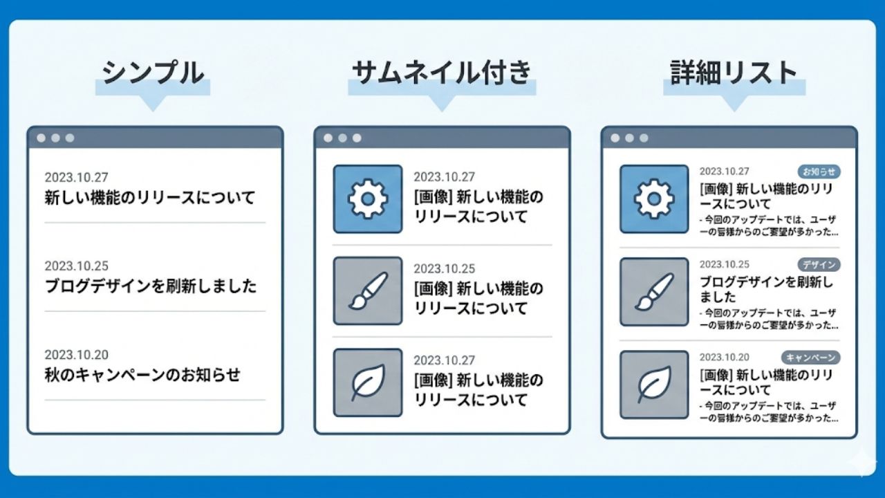 画像付きのタイプは、記事ごとにサムネイル画像が表示されていて、パッと見て何の記事かイメージしやすいですよね。一方、画像なしのタイプは、テキストだけがすっきりと並んでいます。