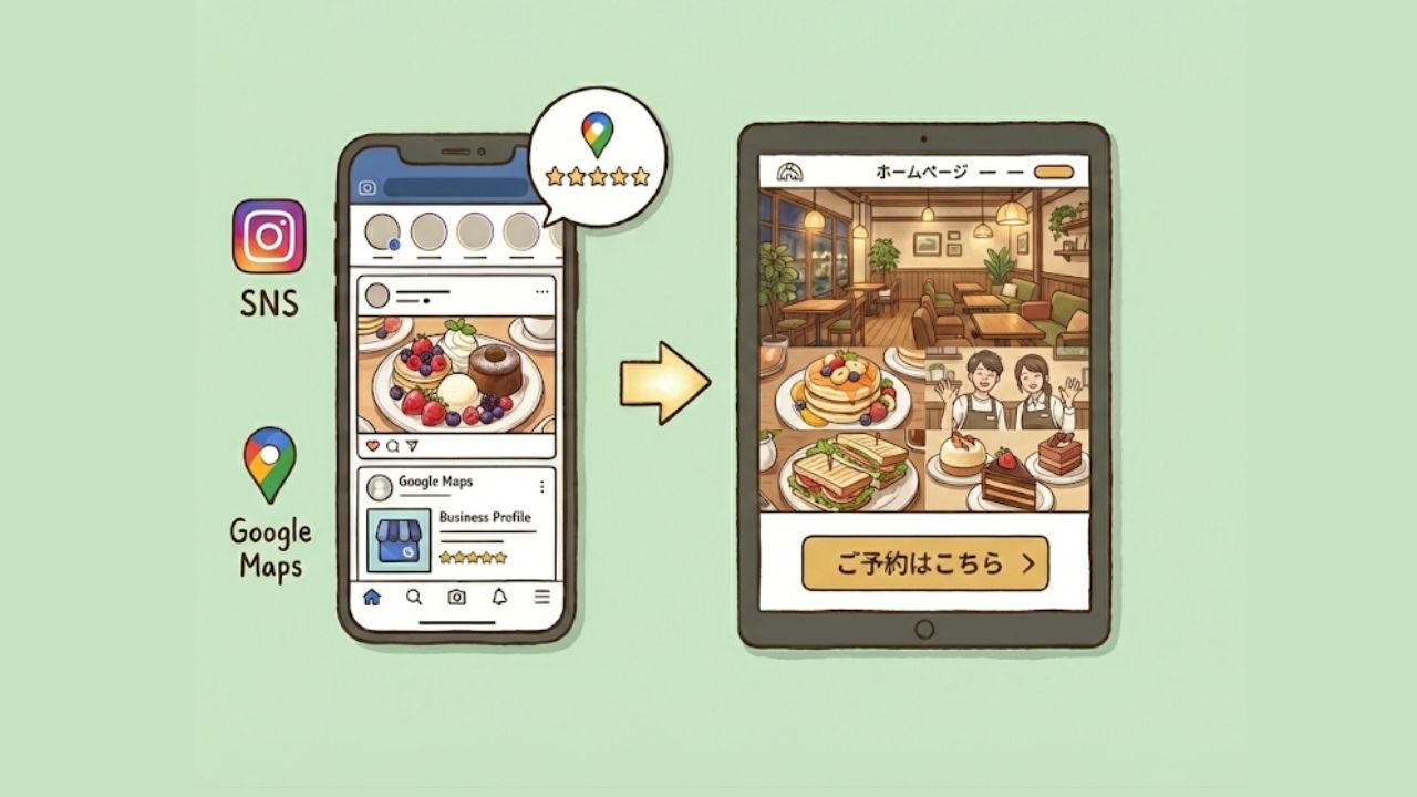 お客様が、InstagramやGoogleマップでお店を知って興味を持つ。そしてお店の公式サイトを見て、そのまま予約する。