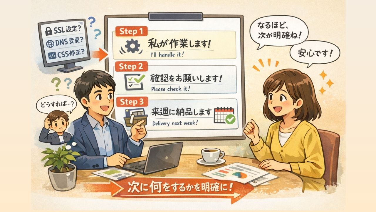 お客様とのやりとりの中で、私がいつも心がけていることがあります。それは、メールや電話での回答の最後に、「次に何をするか」を明確に伝えることです。今日は、このことについて深掘りしたいと思います。