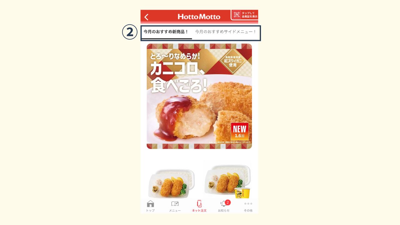 画面の下部を見ると、分かりやすく「メニュー」というアイコンが並んでいます(添付画像の①)。「お、ここかな」と思ってタップすると、なんと現在選択している「店舗の注文ページ」から離脱してしまい、公式サイト全体のメニュー一覧へと飛ばされてしまいました。そこで改めて食べたいものを選んでも、いざ注文しようとすると「店舗を選択してください」と最初の手順に引き戻されてしまう……。お腹が空いている時のこの「二度手間」は、なかなかの精神的ダメージです。