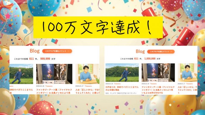 とうとう累計100万文字を達成しました!この記事でちょうどにするので無駄な話はし...